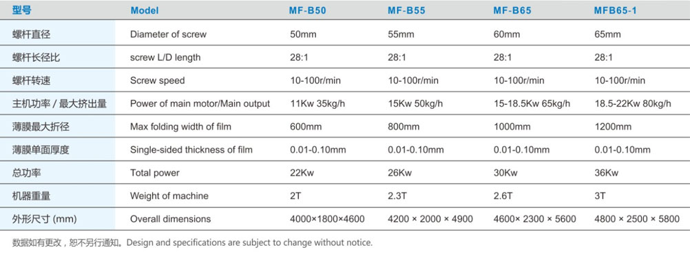 用于吹制高低压聚乙烯,产品广泛用于复合膜,包装膜,农业复盖膜, 纺织品,服装袋或膜等包装;主电机采用变频调速,增加了主机调速的稳 定性,并可节电30%,螺杆料筒采用38铬钼铝,经氮化处理,牵引机架采 用升降式